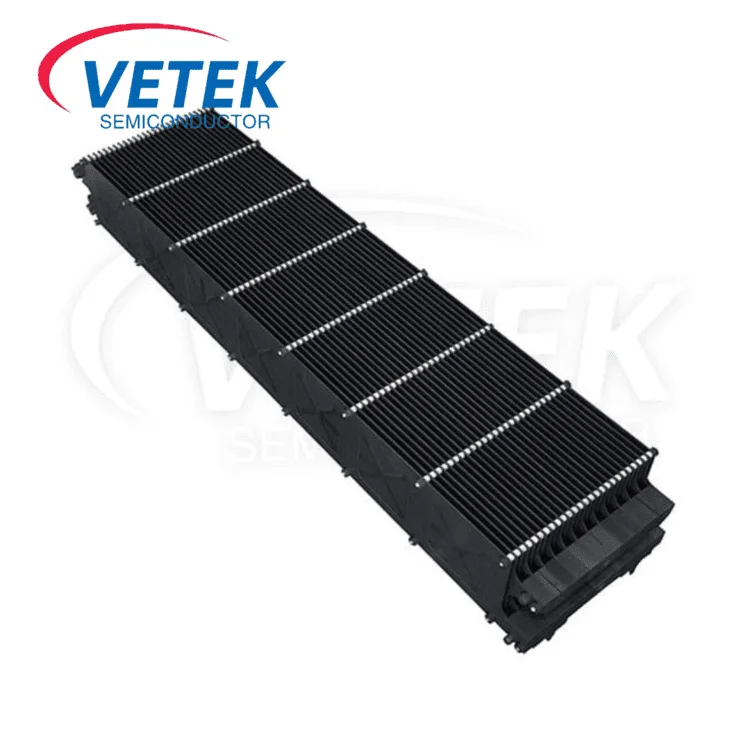 PECVD grafito valtys paprastai naudojamos kaip nešiotojai, skirti nešioti silicio vaflius ar kitas medžiagas, kad būtų užtikrintas saugus šių medžiagų tvarkymas ir gabenimas aukštoje temperatūros ir plazmos aplinkoje. Pavyzdžiui, puslaidininkių gamybos procese „Veteksemicon“ PECVD grafito valtys yra skirtos plazmoje sustiprinti cheminio garų nusėdimo procesus. Grafito valtis vaidina silicio nitrido (SINₓ) pasyvavimo sluoksnių ir žemų dielektrinių konstantos (žemos K) plėvelės vaidmenį.